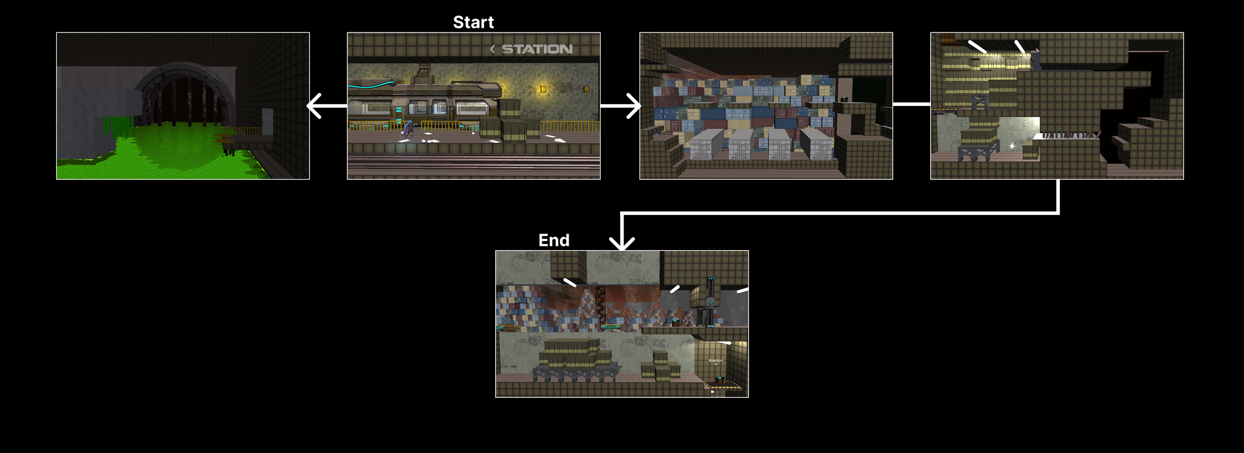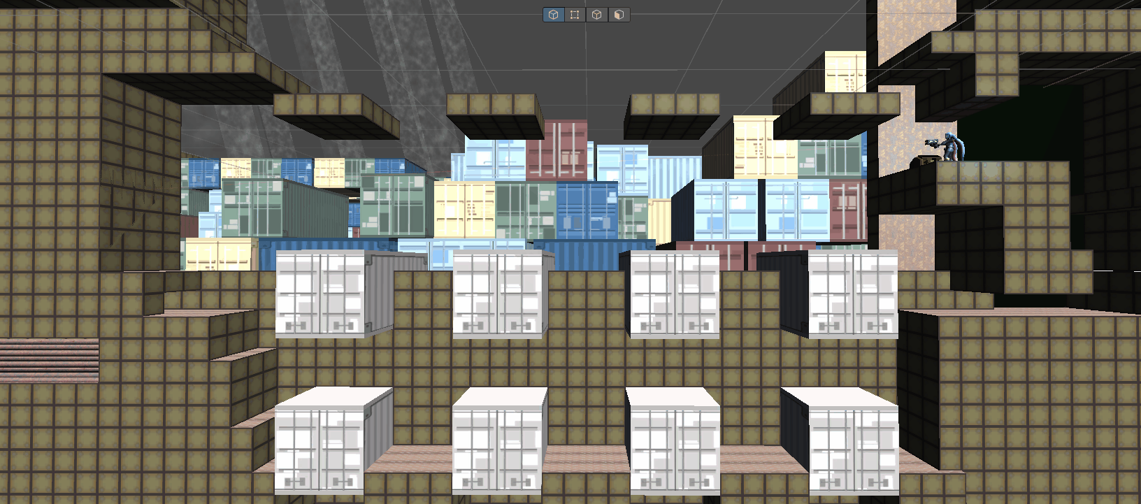 After brainstorming concepts with my lead and creative director we landed on prototyping and blocking out this hanging shipping container space where the player needs to use the batteries to turn them on and navigate the space.